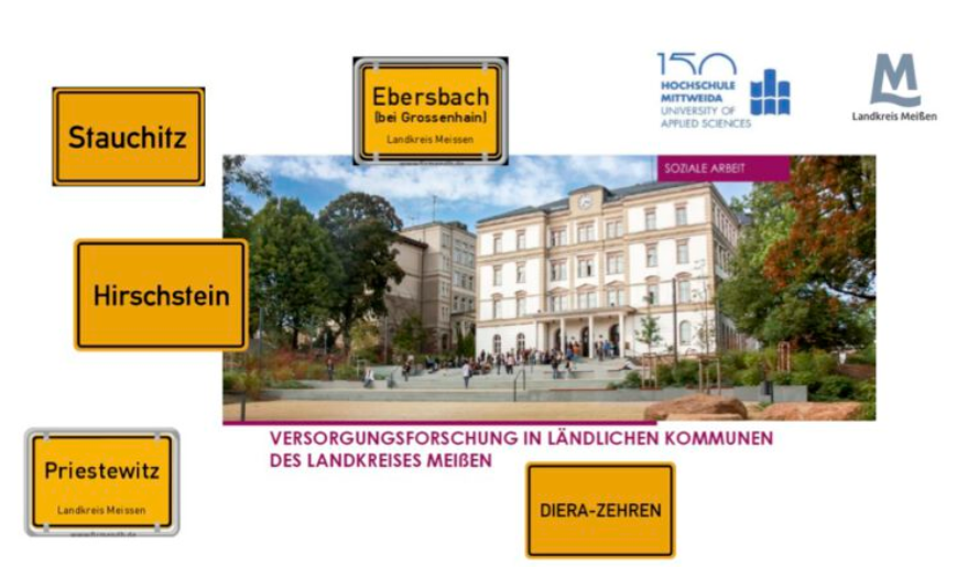 Ziel der Untersuchung war es, ausgewählte Kommunen in ländlichen Räumen des Landkreises Meißen darin zu unterstützen, Sorge- bzw. Care-Strukturen für Menschen im sogenannten vierten Lebensalter zu entwickeln sowie Angebote der pflegerischen Versorgung zu optimieren. Diera-Zehren, Ebersbach, Hirschstein, Priestewitz und Stauchitz sind die Modellkommunen und Partner in diesem Projekt.